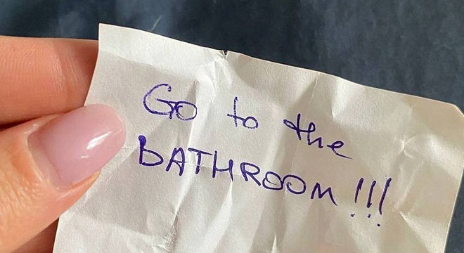 I was confused, my heart now pounding in my chest. I peeked at the note. “Go to the restroom.” That’s all it said.