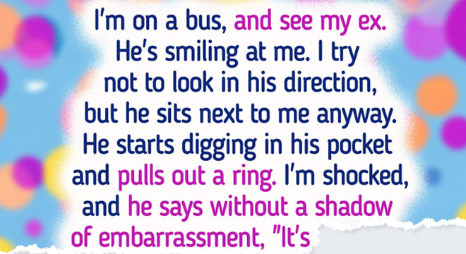 I’m on a bus, and see my ex. He’s smiling at me. I try not to look in his direction, but he sits next to me anyway. He starts digging in his pocket and pulls out a ring.