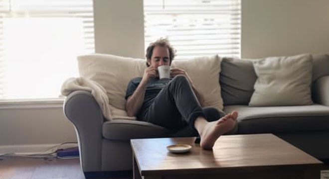 When I stumbled out of bed the following Monday morning to feed our toddler, I found him sitting on our lumpy sofa with his feet kicked up.