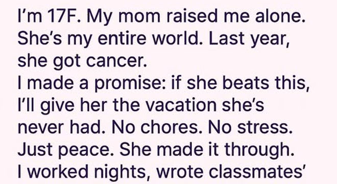 I’m Vera, 17. After my mom beat cancer, I made a silent promise: I’d give her something she’d always dreamed of but never had — a week by the ocean, with no chores, no worries, just peace.