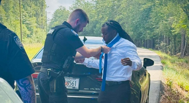 Rather than issue a citation, Deputy Byers paused. He helped the man fix his tie. He listened. He stood quietly with him, offering compassion in the middle of a highway shoulder.
