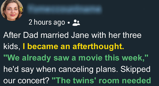 Jane had three kids from her previous marriage: Logan, Tyler, and Emma. Almost overnight, Dad’s house became a home for them, and I became the visitor. At first, he tried to merge the families, inviting me to birthday parties and game nights.