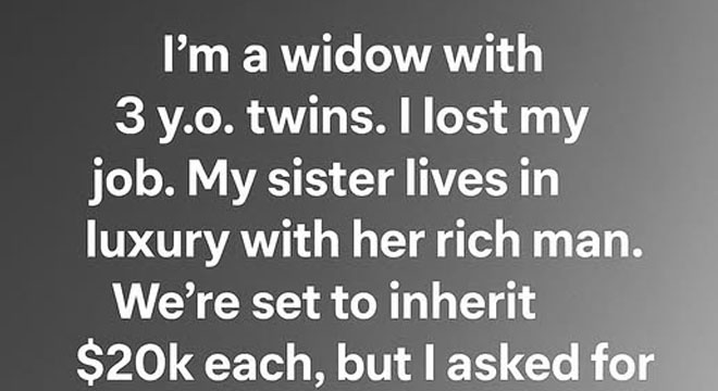 I’m a widow with three-year-old twins, struggling to make ends meet after losing my job. My sister, on the other hand, lives a life of luxury thanks to her wealthy husband.Recently, we learned we would each inherit $20,000 from a distant relative. Knowing how difficult my situation was, I asked my sister if she could give me her share so I could provide a stable future for my children.