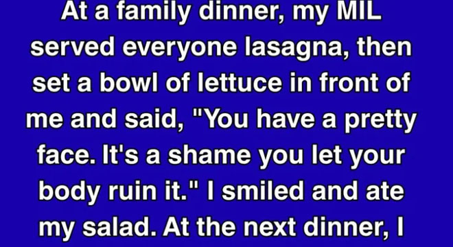 At that first dinner, she handed everyone heaping plates of lasagna—except me. My plate held only lettuce. With a syrupy smile, she said, “You have such a pretty face. It’s a shame you let your body ruin it.” I didn’t flinch. I smiled, ate my salad, and quietly decided: I wouldn’t fight her with anger. I’d fight her with self-respect. The next week, I brought her a gift—a mirror with a note that read, “Since you’re so focused on appearances, I figured you’d want to see your own.” She laughed it off, but I saw the sting in her eyes. It didn’t end the cruelty—it began a quiet war.
