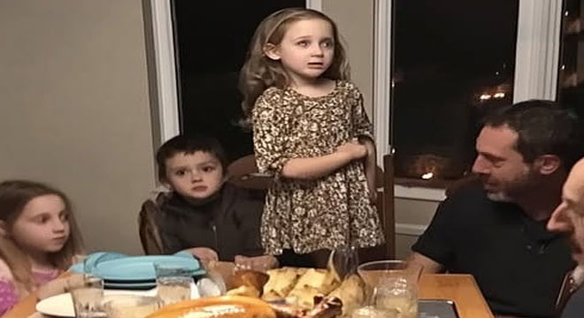 I was about to carve the turkey after everyone had taken their seat, and Peter was ready by my side to begin dishing out slices when, out of nowhere, our daughter surprised us by standing on her chair. Her tiny frame somehow commanded the entire room’s attention.