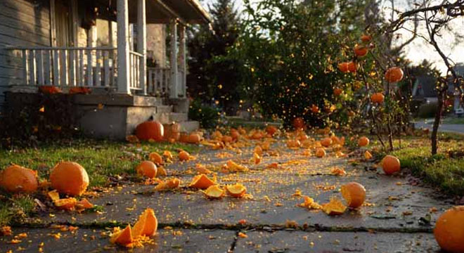 Pumpkins were smashed into mush across the walkway, orange pulp and seeds scattered everywhere like some kind of horrible crime scene.