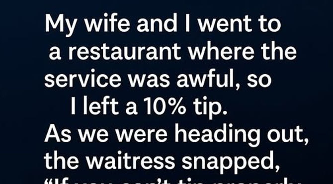 After a long day on the road, my wife and I stopped at a small restaurant just looking for a quiet meal. The food was fine, but the waitress seemed overwhelmed—slow, distracted, almost trembling. When the bill came, I left a modest ten-percent tip and headed for the door. That’s when her voice cut through the room: “If you can’t tip properly, don’t dine out!” My wife stiffened immediately, insisting I report her.