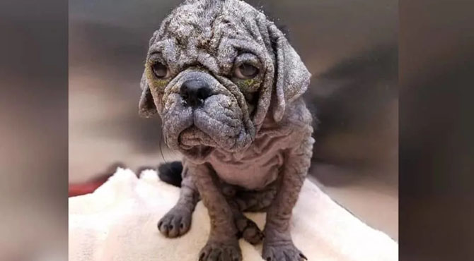 At the rescue, his condition shocked everyone, because his mange and skin infections had gone on for so long that his whole body was almost naked except for one tiny curly tail.