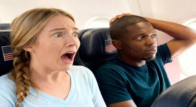 Most of the cabin was asleep—heads tilted against headrests, thin airline blankets pulled up to chins, seatback screens throwing that soft blue glow onto faces that weren’t really watching anything. In 8A, a Black man in a wrinkled gray sweater slept with his temple pressed to the cold oval window, his reflection faint against the endless dark outside.