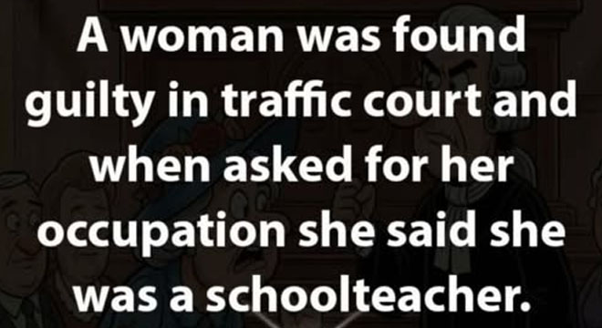 A woman was found guilty in traffic court and when asked for her occupation she said she was a schoolteacher.