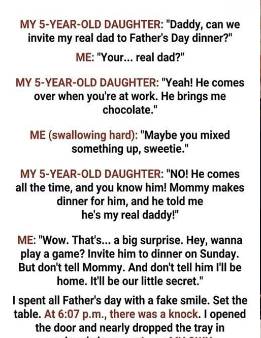 The air in the room seemed to vanish. I felt a sudden, sharp ringing in my ears as my brain struggled to process the question. I laughed softly—a nervous, reflexive sound—and asked her to repeat herself, certain that I had misinterpreted the whimsical ramblings of a preschooler. But Lily didn’t falter. She nodded with a jarring level of confidence and explained that her “real dad” was someone who visited the house while I was at work. He was kind, she said, and he often brought her chocolate as a secret treat.