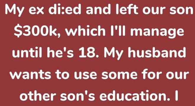I also have another son, 12, from my second marriage, and my husband wants to use some of that money for our other son’s education.